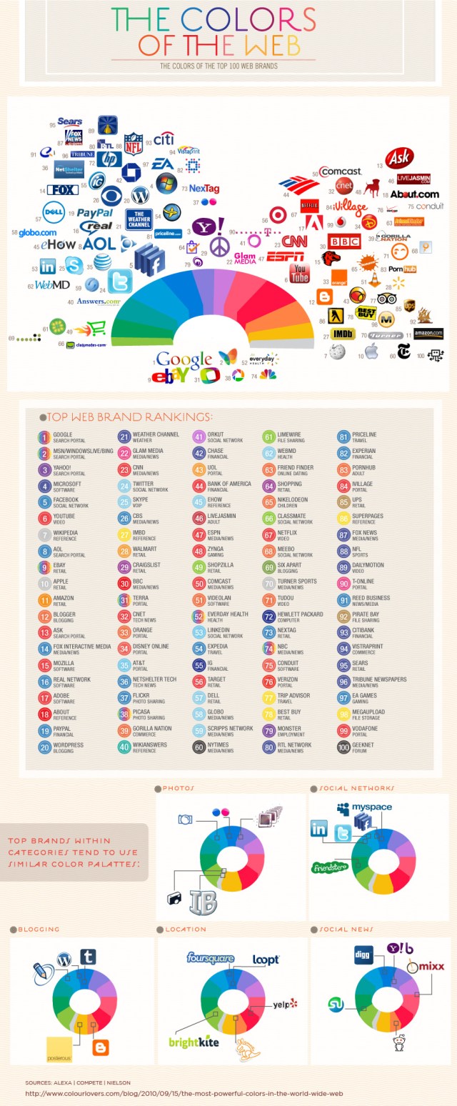 Do you ever wonder why certain companies choose a specific logo color? Have you noticed that companies in the same industry usually have the same logo colors? This very interesting blog post from the Colourlovers blog describes in detail the various similarities and differences of color in regard to logos. Colourlovers checked out the top 100 sites in the world and found some very interesting results. Red and blue dominate the logos in corporate america and it has been that way for almost a decade.