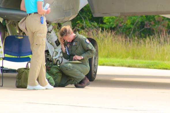 Our day started off with the FOD walk on the runway, then we got to see various military and civilian planes taxi in from the Dulles airport and park outside the museum. This was my first time watching a real live military jet taxi less than 60 feet away from me. Needless to say, it was AWESOME to watch. Trying to capture the heat coming out of the jet engines from a distance on my Canon proved to be an interesting challenge for me. We also had the treat of seeing the first female CAG (the head of an aircraft carrier) arrive via….F-18. Talk about an entrance!