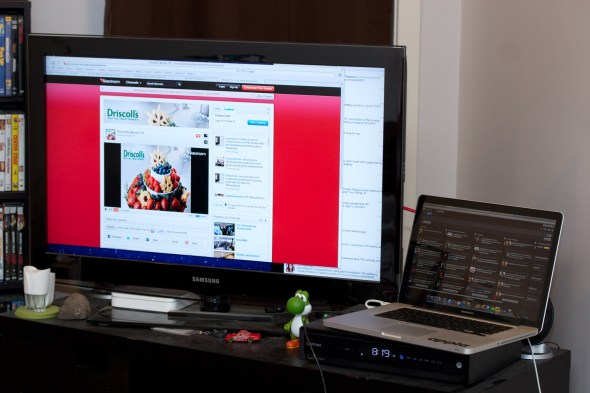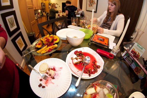 However, all the dishes we prepared ended up turning out amazing. We had Brie with a delicious berry and pistachio sauce and some acorn squash with a different berry glaze. The group loved the beer can chicken which was quite delicious (not to toot my horn). Meanwhile we had my MacBook Pro hooked up to our HDTV with the livestream of the event in NYC playing while monitoring the online conversation with *two* Twitter clients. Needless to say, we all had a blast and it was great to hear what the online group had to say.