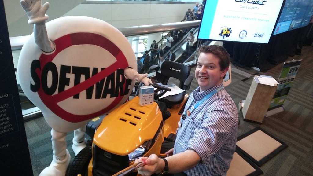 Both Jules and I recently got back from San Francisco for Dreamforce. It was my 4th, her 1st, and a great experience all around. We (Acumen Solutions) had a bigger presence than we have ever had before that stretched across 4 booths and 2 meeting spaces. Once again, Prototype Playground was the main booth draw at the booth and we had some great stuff to show. From an Oculus Rift connected to a Leap Motion, to a Nymi band, to an Apple Watch, and even a Connected 3D Printer- we had a ton of cool things. Plus, one of our smaller booths had a bluetooth connected tractor in it (which Jules managed)! It was a busy but rewarding week.