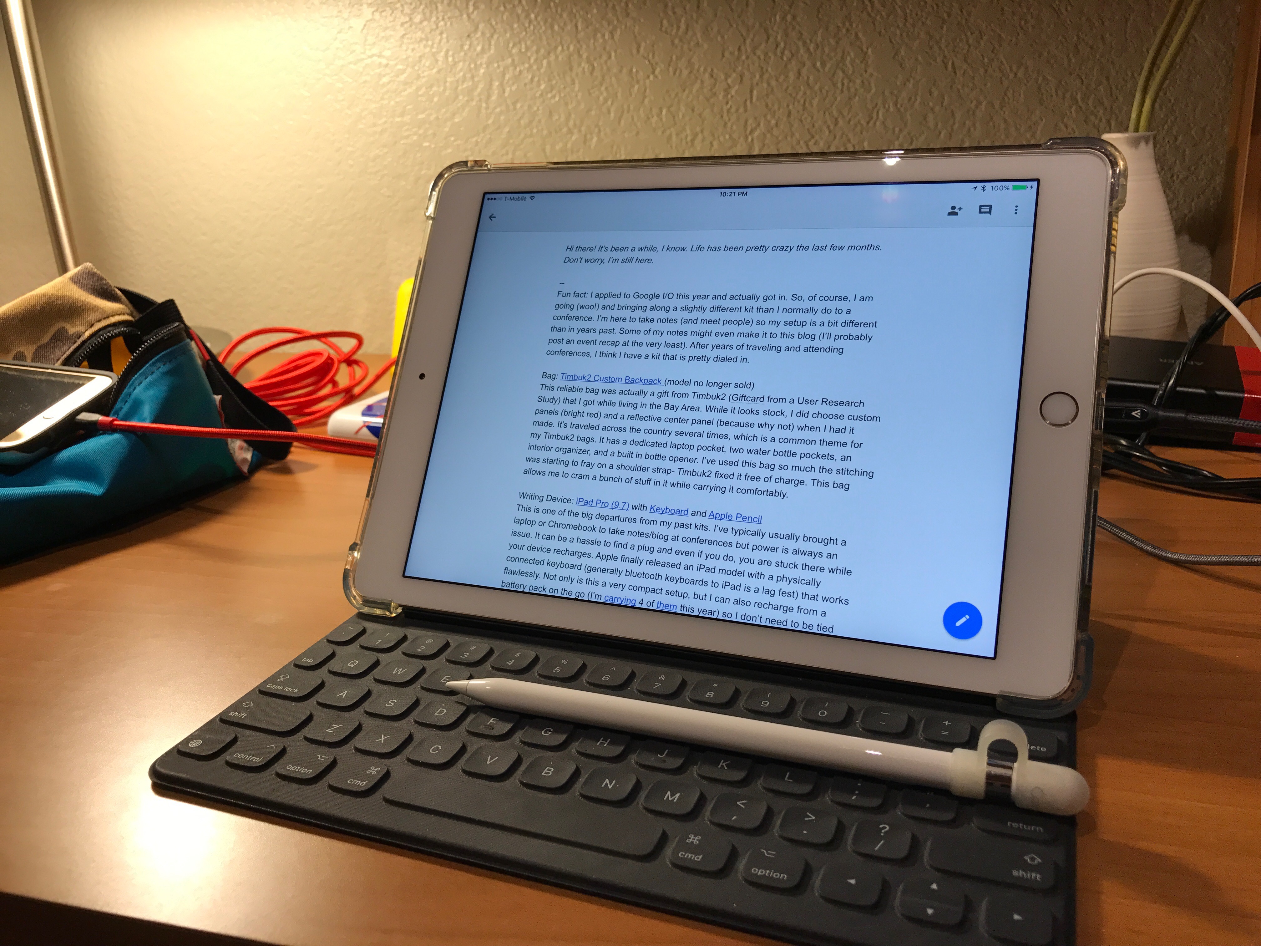 Fun fact: I applied to Google I/O this year and actually got in. So, of course, I am going (woo!) and bringing along a slightly different kit than I normally do to a conference. I’m here to take notes (and meet people) so my setup is a bit different than in years past. Some of my notes might even make it to this blog (I’ll probably post an event recap at the very least). After years of traveling and attending conferences, I think I have a kit that is pretty dialed in.